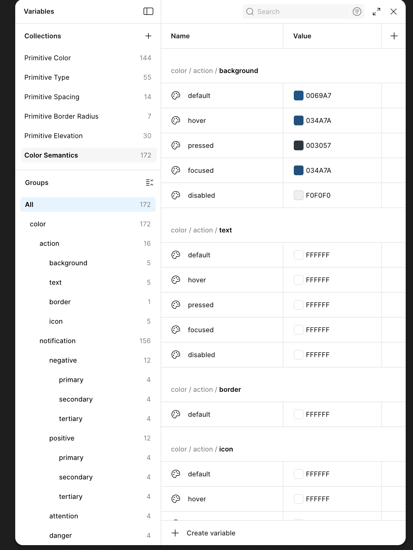 Naming conventions were designed to be legible to both designers and developers — structured so the path itself communicated category, role, property, and state without requiring lookup. The goal was zero ambiguity between what a token was called in Figma and what it was called in code.